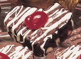 Utilizar el papel aluminio para retirar las brownies del molde, desprender el aluminio. Cortar las brownies con cortadores para galleta para dar forma o cortarlos en cuadrados. Adornar con lineas de chocolate blanco derretido y mitades de cereza maraschino, si se desea refrigere hasta que las lineas de chocolate estén firmes; refrigere el restante de las brownies. Rinde 16 brownies aproximadamente.